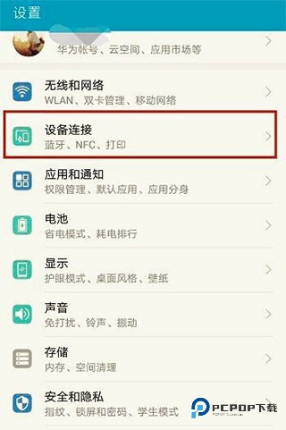 1、进入手机设置界面 → 点击 "设备连接" 选项